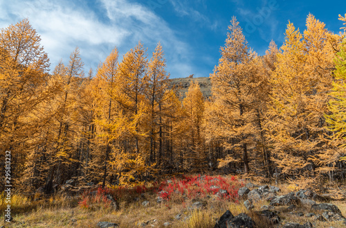 © kotopalych, Fototapeta premium Beautiful red grass on a background of yellow larch