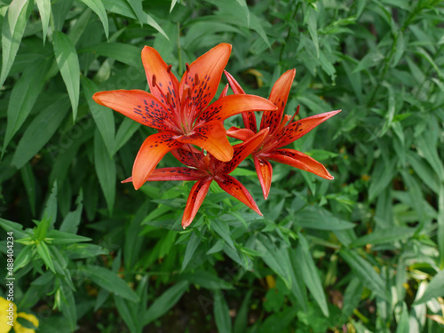 Fototapeta premium beautiful red lily flower on a background of green leaves