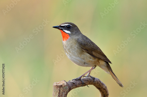 Fototapeta premium Beautiful red neck bird spot perching on wooden stick, Siberian rubythroat (Calliope calliope)