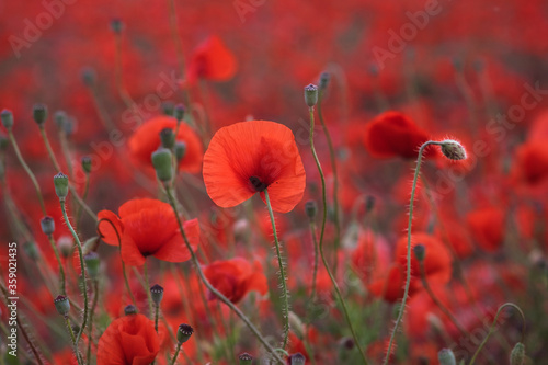 © Elena Krivorotova, Obraz premium Beautiful red poppies in the field, close-up.