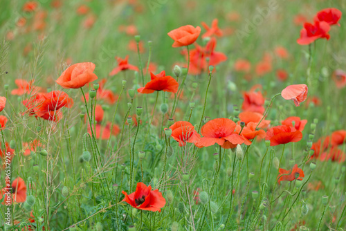 Fototapeta premium Beautiful red poppies on a summer field. Opium flowers, wild field. Summer...