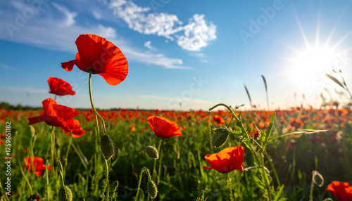 Naklejka premium Beautiful red poppy flowers blooming in a sunny meadow under clear blue sky.