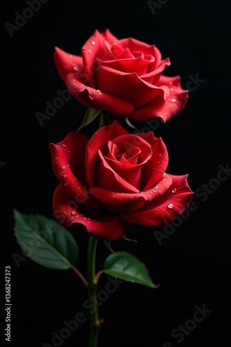 © Thiti, Fototapeta premium Beautiful red roses with water droplets on black background, romantic, nature