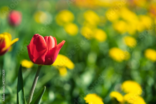 Obraz premium Beautiful red spring tulip on the yellow dandelion lawn