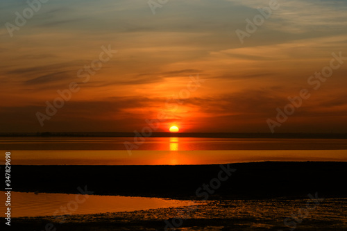Naklejka premium Beautiful Red Sunset near the seaside with some clouds