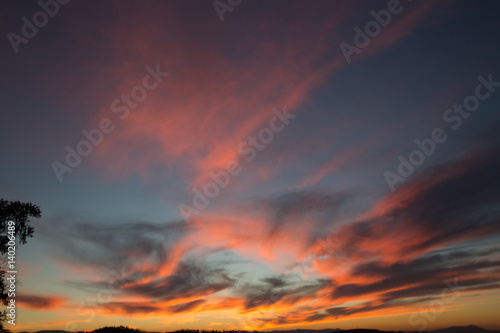 © alenaslostina, Fototapeta premium Beautiful red sunset over the field and forest