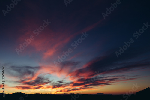 © alenaslostina, Fototapeta premium Beautiful red sunset over the field and forest