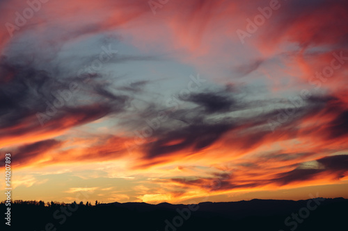 © alenaslostina, Fototapeta premium Beautiful red sunset over the field and forest