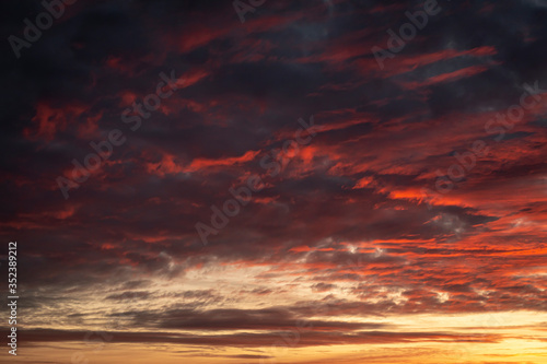 © Aleksey, Fototapeta premium Beautiful red sunset with gloomy clouds. The day is ending.