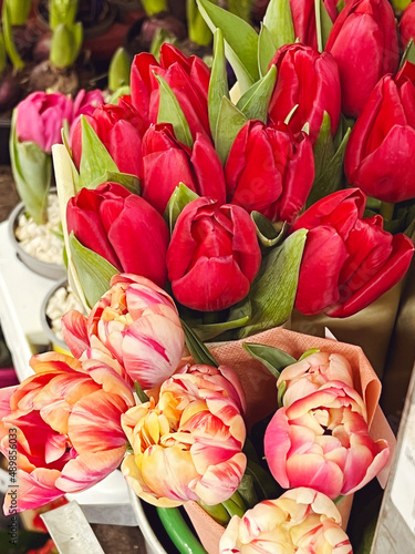 Fototapeta premium Beautiful red tulips bouquets in flowers shop