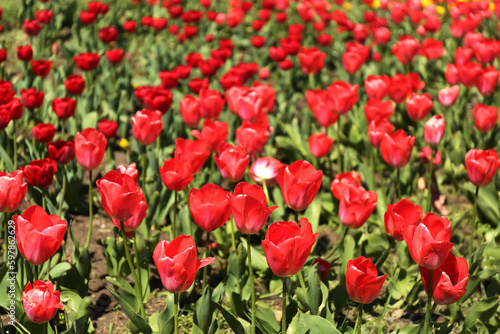 Fototapeta premium Beautiful red tulips on spring day, closeup