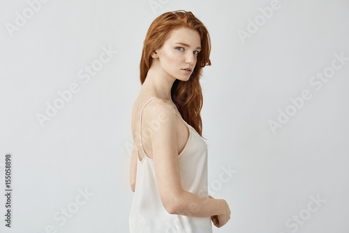 © Cookie Studio, Fototapeta premium Beautiful redhead model in sleepwear posing looking at camera.