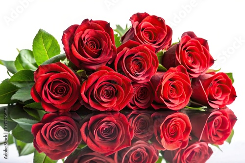 © yuwaree, Obraz premium Beautiful reflected bouquet of red roses on white background