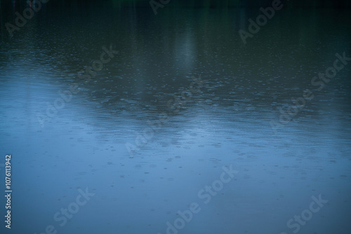 © Thinapob, Fototapeta premium ฺBeautiful Reflected the Rain falls on the water surface in nature forest Mountain natural atmosphere rain fog sky abstract with white clouds background.