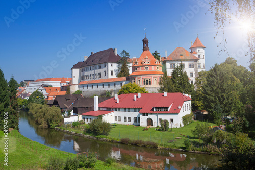 Fototapeta premium Beautiful renaissance style castle, 16th century, with Roundel pavilion on the hill near the river Nezarka in Jindrichuv Hradec. Czech Republic
