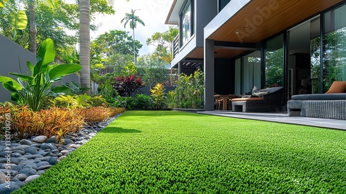 © Ammar, Obraz premium Beautiful residential house with a lush green lawn