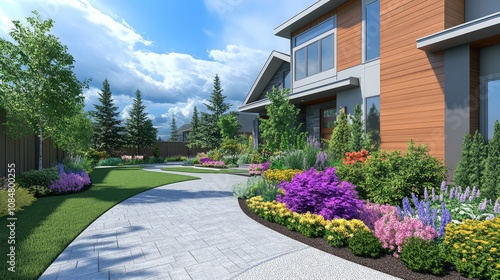 Naklejka premium Beautiful residential landscape design featuring colorful flowers, lush greenery, and a stone pathway leading to a modern home against a vibrant sky.