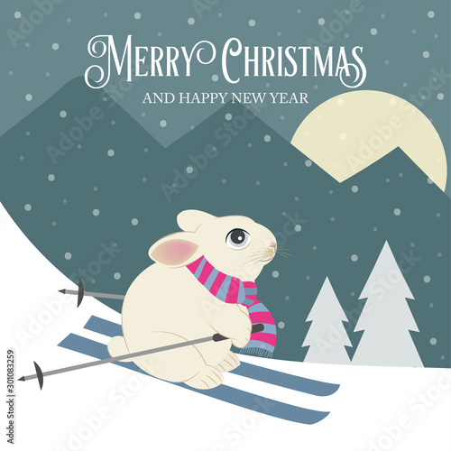 © Claudia Balasoiu, Fototapeta premium Beautiful retro Christmas card with rabbit skier. Flat design. Vector