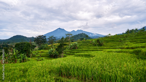 © Rachmattt, Fototapeta premium Beautiful rice field scenery with mountain background