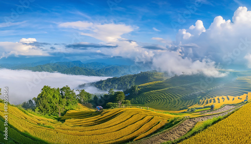 © athapet, Fototapeta premium Beautiful rice terrace on the mountains in harvest season, in the fog and sunlight, AI generative