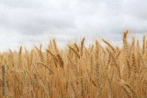 Fototapeta premium Beautiful ripe wheat spikes in agricultural field