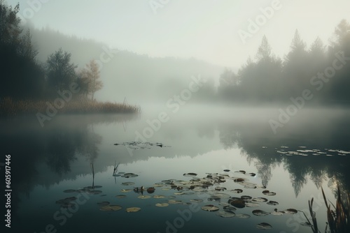Fototapeta premium beautiful river with fog and mist around. Generative AI