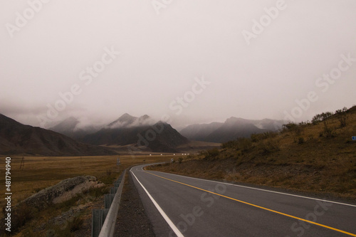 Fototapeta premium Beautiful road in the mountains, late autumn . The peaks of the mountains are covered with fog. Altai.