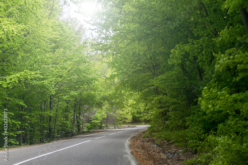 © bogdan vacarciuc, Fototapeta premium Beautiful road that crosses a forest. Raw green early spring