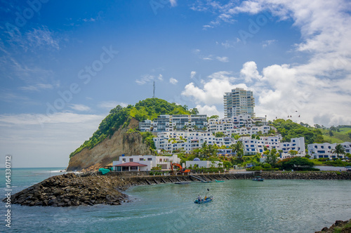 © Fotos 593, Naklejka premium Beautiful rocky beach with a buildings structure of hotels behind in a beautiful day in with sunny weather in a blue sky in Same, Ecuador