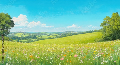 © rach, Obraz premium Beautiful rolling green hills and colorful flowers under blue sky