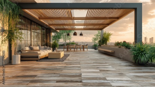 © backup_studio, Naklejka premium Beautiful rooftop veranda with comfortable furniture, outdoor dining set, modern design ideal for relaxation, party, event, or social gathering