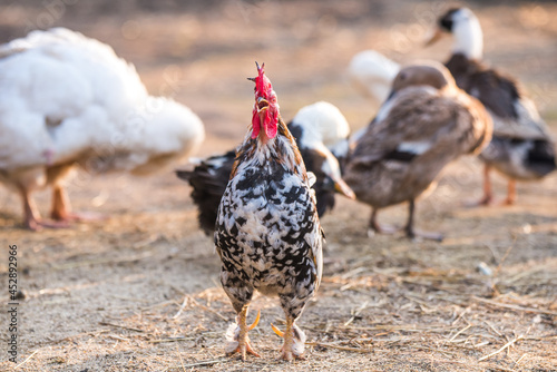 Fototapeta premium Beautiful rooster sings at dawn standing on the yard