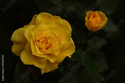 © Mariia, Fototapeta premium Beautiful rose in the sunshine. Flower of Yellow rose in the summer garden. Yellow roses on dark background with shallow depth of field. Yellow garden rose on a bush in a summer garden. Flower petals