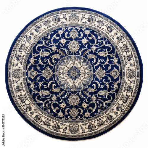 © HecoPhoto, Naklejka premium Beautiful Round Blue and White Decorative Rug with Intricate Floral Patterns for Home Decor