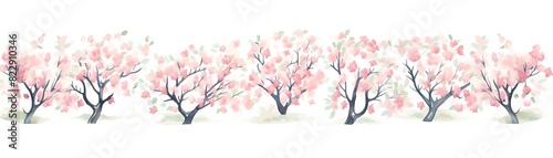 © kamon, Fototapeta premium Beautiful row of cherry blossom trees in full bloom, displaying delicate pink petals on white background, perfect for spring-themed projects.