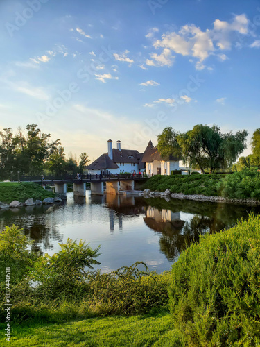 © Marina Radchenko, Obraz premium Beautiful rural landscape, lake house, reflection in water