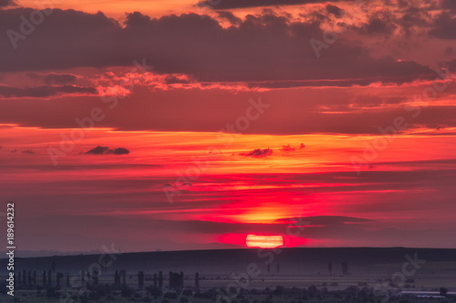 Obraz premium Beautiful rural landscape with a big red setting sun over the fields, Dobrogea, Romania