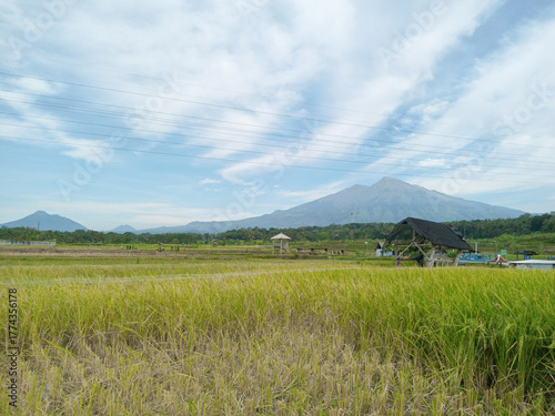 © Camellia ., Fototapeta premium Beautiful rural landscape with golden rice fields, a small wooden hut, and a majestic mountain under a bright blue sky with clouds. Peaceful countryside scenery in harvest season.