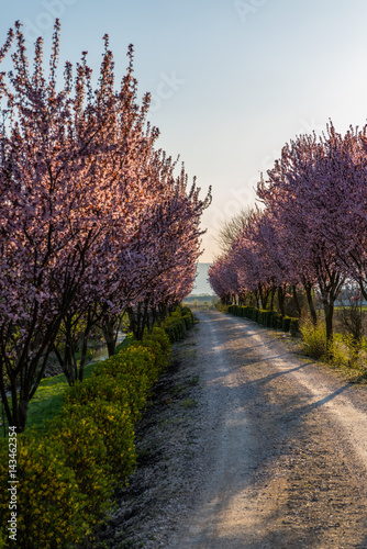 Fototapeta premium Beautiful Rural road surrounded by trees in bloom