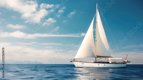 Fototapeta premium Beautiful sailboat gliding smoothly across calm blue ocean waters under a clear sky with soft white clouds
