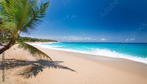 © Halee, Obraz premium Beautiful Sandy Beach And Soft Blue Ocean Waves And Palm Trees