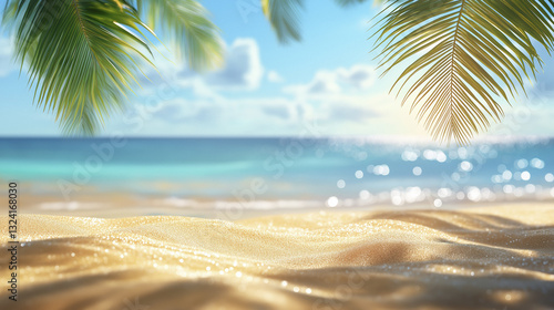 © BrightSpace, Obraz premium beautiful sandy beach with palm trees and serene ocean view, perfect for relaxation. sun shines brightly, creating tranquil and inviting atmosphere