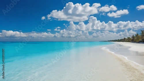 © Mst, Fototapeta premium Beautiful sandy beach with white sand and rolling calm wave of turquoise ocean on Sunny day. White clouds in blue sky are reflected in water. Perfect background.