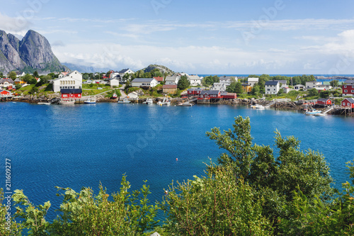 Fototapeta premium Beautiful scandinavian landscape with mountains and fjords. Panorama view of Reine village on Lofoten islands, Norway.