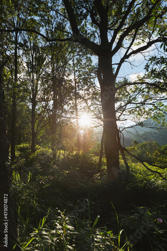 © lzf, Obraz premium Beautiful scene misty forest with sun rays through the tree leaves
