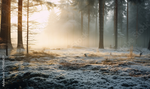 © Andrii IURLOV, Naklejka premium Beautiful scene of winter forest. Colorful morning view of misty mountains during sunrise. Beauty of nature concept background.