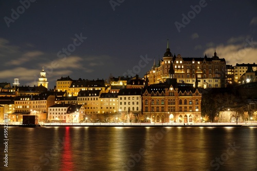 Fototapeta premium Beautiful scenery of illuminated Stockholm waterfront view towards Sodermalm...