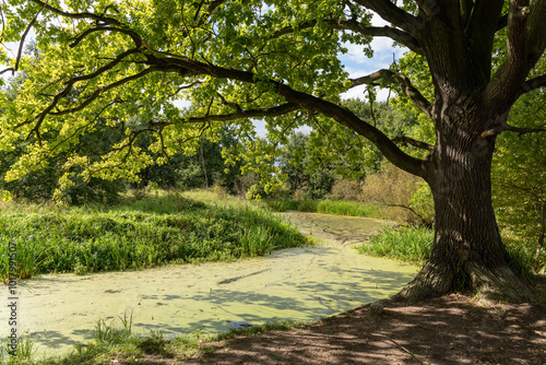 © Maryia, Naklejka premium Beautiful scenery on the marsh. Branches of an oak tree hanging over the green water. Swamps are the lungs of the Earth. High quality photo