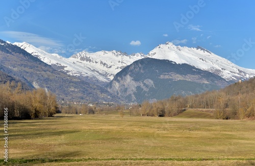 Fototapeta premium beautiful scenic landscape in alpine mountain snowy and large meadow in Savoy, europe