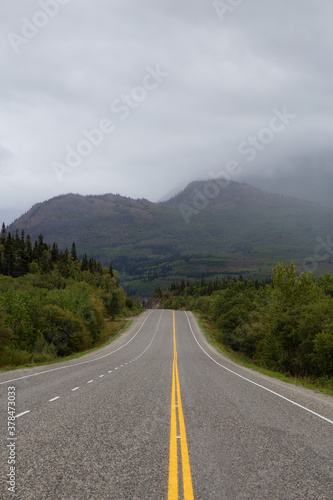 Fototapeta premium Beautiful Scenic Road, Klondike Hwy, in the Canadian Nature during Fall Season. Taken in Yukon, Canada.